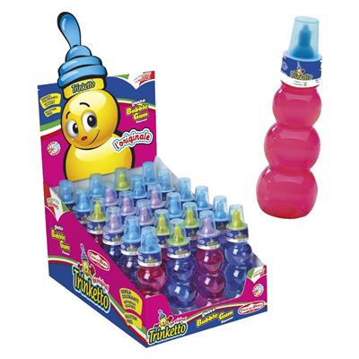 Trinketto e' la famosa caramella liquida fatta di acqua e zucchero (al gusto bubble gum), senza coloranti, infatti il liquido è trasparente e la bottiglia è colorata.