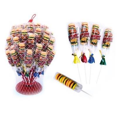 Deliziose caramelle gommose a forma di burger sullo stecco come un lecca lecca.