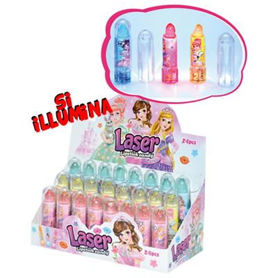 Candy lipstick rossetto gusto frutta con luce colorata laser a led che si attiva al movimento. Ogni espositore contiene 24 candy lipstick.