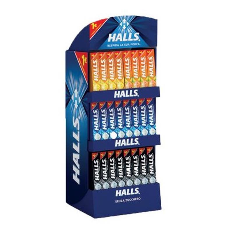 Nuovo espositore Halls 144pz composto: 48 Halls Blu S.Z, 48 Halls Nere S.Z, 24 Halls Miele, 24 Halls Agrumi