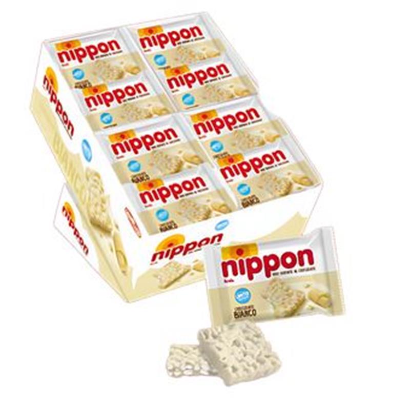 Cosa rende Nippon lo snack leggero e irresistibilmente goloso? Semplice, la sua perfetta ricetta: riso soffiato, crispies, cornflakes e crema di cacao, ricoperti di finissimo cioccolato al BIANCO. Un mix equilibrato tra leggerezza croccante e infinita golosità. Ecco perché Nippon è così irresistibile. E inimitabile!