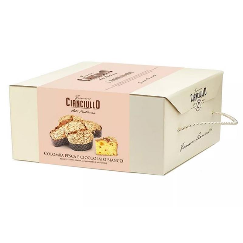 Dolce lievitato di Pasqua a forma di colomba. Nasce attraverso una naturale lievitazione di 48 ore, con Lievito Madre, burro belga, uova fresche di cat.A, morbidi cubetti di pesca e cioccolato bianco. Soffice e dal gusto fresco di frutta. La copertura con glassa all’amaretto e granella di mandorle aggiungono dolcezza e croccantezza al dolce.