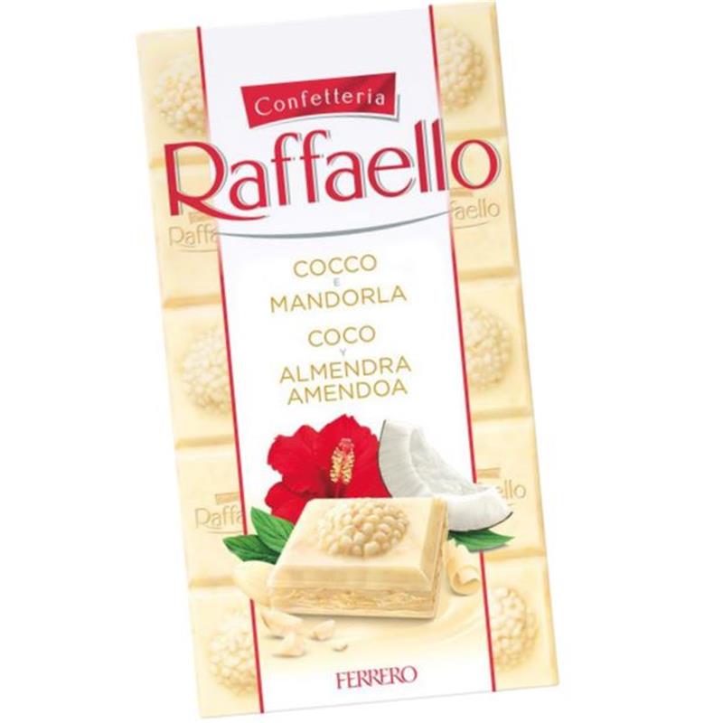 Finissima tavoletta di cioccolato Ferrero Raffaello al gusto di cioccolato bianco e scaglie di cocco e mandorla