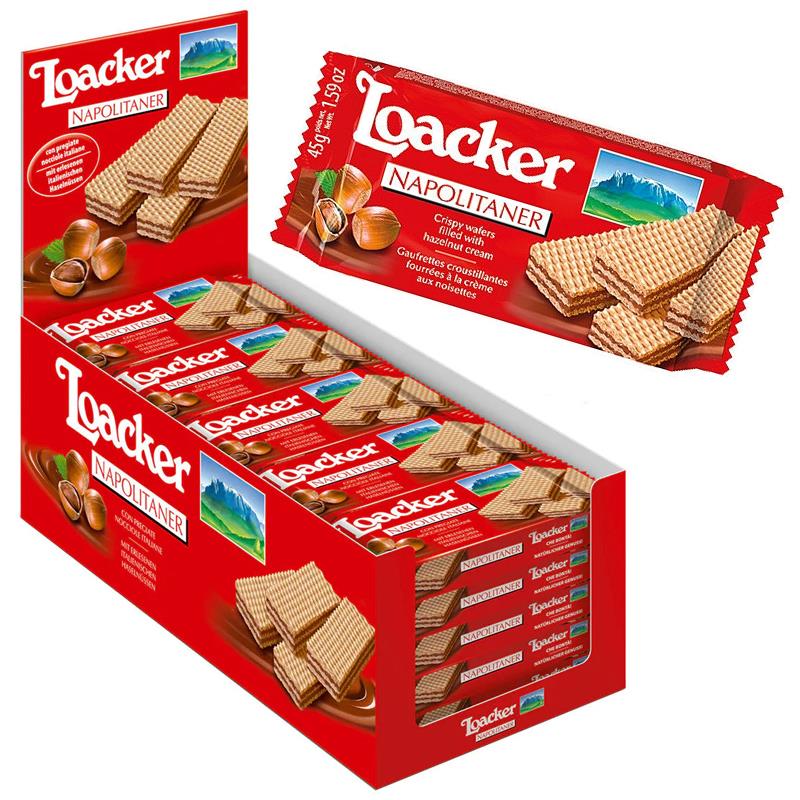 il Classic Napolitaner di Loacker. L'inimitabile rosso Loacker, il più famoso della linea wafer, amato da grandi e piccini. Tre strati di fragranti cialdine farcite con finissima crema alla nocciola. Una scorta di pura bontà a base di crema alle nocciole 100% italiane (crema 75%), selezionate con cura e tostate in casa Loacker a 1000 metri d'altitudine. Da condividere in famiglia e nelle feste con amici e parenti. I momenti di relax, in compagnia o da soli, non sono veramente tali senza gustare uno snack delizioso. Comodo display da 25 pezzi (45g ognuno). Racchiuse nella pratica confezione salvafreschezza dal caldo colore rosso si trovano 25 specialità dal gusto inimitabile.