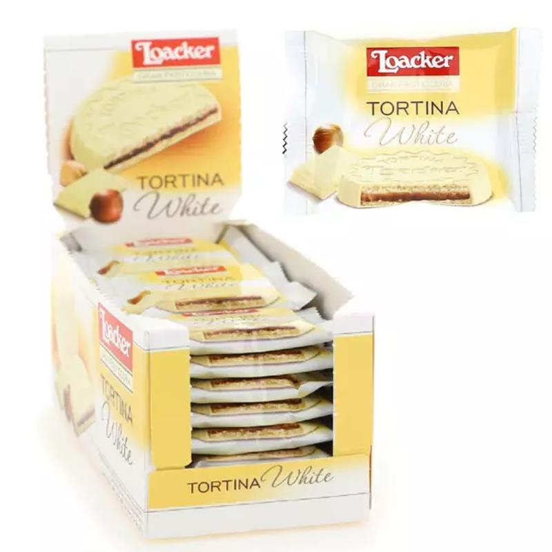 Loacker Gran Pasticceria TortinaWhite Una Vera Delizia , Bastera' Un Assaggio E La Sua Armonia Vi Deliziera' : Prima La Fine Copertura Di Cioccolato Bianco Poi Le Due Sottili Cialde Di Wafer E Infine Il Cuore Di Crema Alle Nocciole.