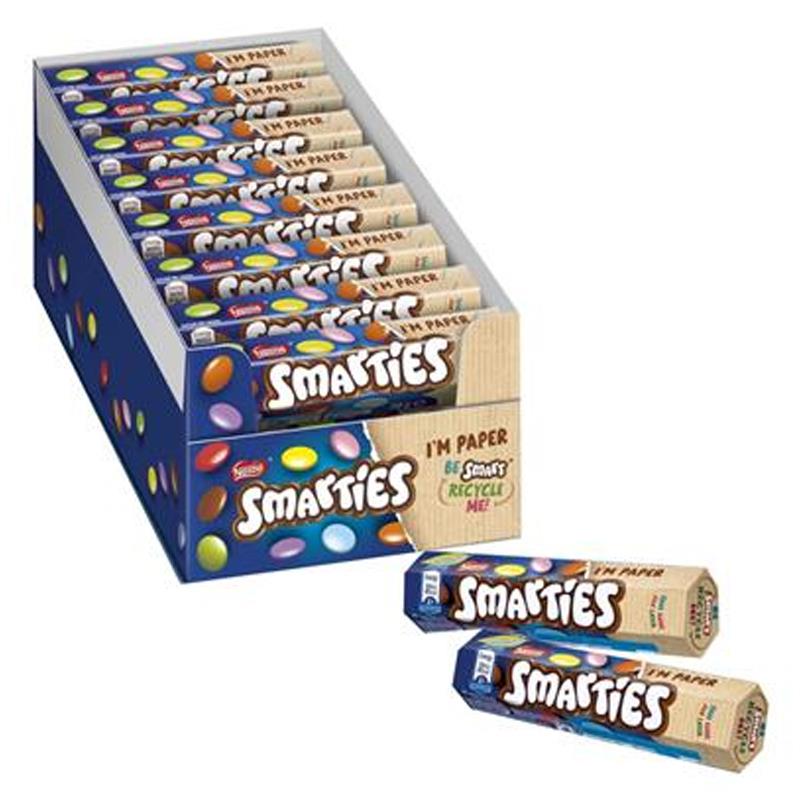 Smarties: confetti colorati di cioccolato al latte in astuccio classico.