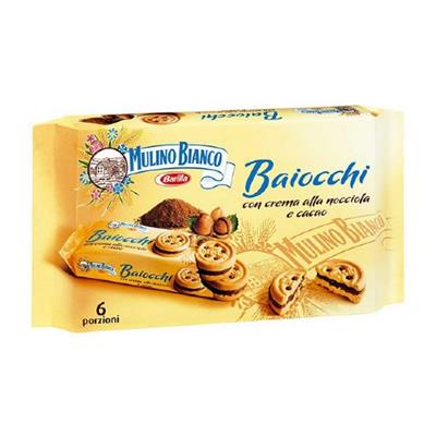 I Baiocchi sono realizzati con due biscotti di fragrante pastafrolla dalla forma inconfondibile che racchiudono un cremoso ripieno alla nocciola e cacao.