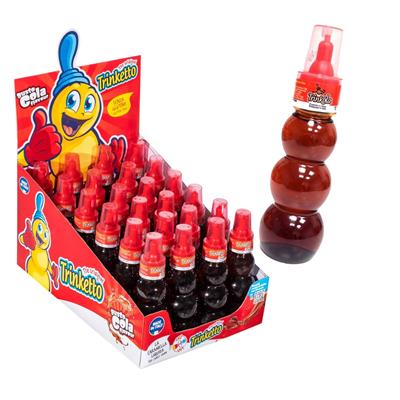 Trinkola e' la famosa caramella liquida fatta di acqua e zucchero al gusto cola, senza coloranti, infatti il liquido è trasparente e la bottiglia è colorata.