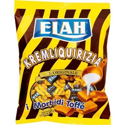 Elah Krema/Liqurizia è la classica morbida e gustoda caramella Toffee alla liquirizia, confezionata in questa busta da Kg. 1