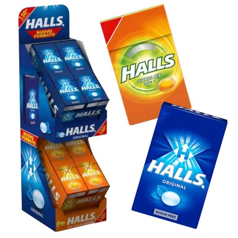 Nuovo espositore Halls 144pz composto: 48 Halls Blu S.Z, 48 Halls Nere S.Z, 24 Halls Miele, 24 Halls Agrumi
