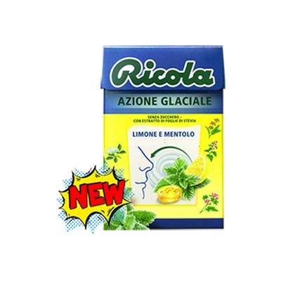 Ricola astuccio nel formato tascabile al gusto di limone e mentolo (azione glaciale), con estratto di foglie di stevia.