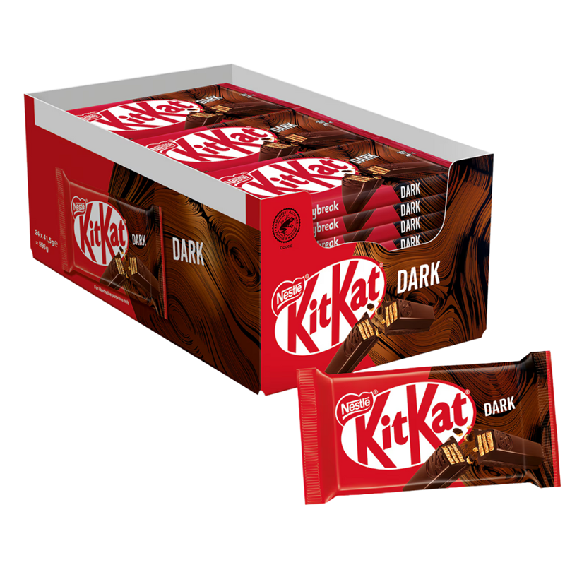 KitKat Dark Nestlé: croccante wafer a strati ricoperto da cioccolato fondente al 70%. Perfetto per chi ama un gusto più deciso e autentico in una pausa leggera e raffinata.