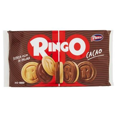 Confezione Famiglia Ringo Cacao costituito da 6 Razioni biscotto da 55 grammi, ripieno di crema al cioccolato e con una fragante consistenza del biscotto.