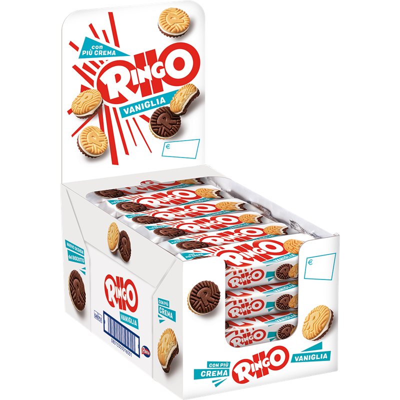 Confezione Ringo Vaniglia costituito da 24 Razioni biscotto da 55 grammi, ripieno di crema alla vaniglia e con una fragante consistenza del biscotto.