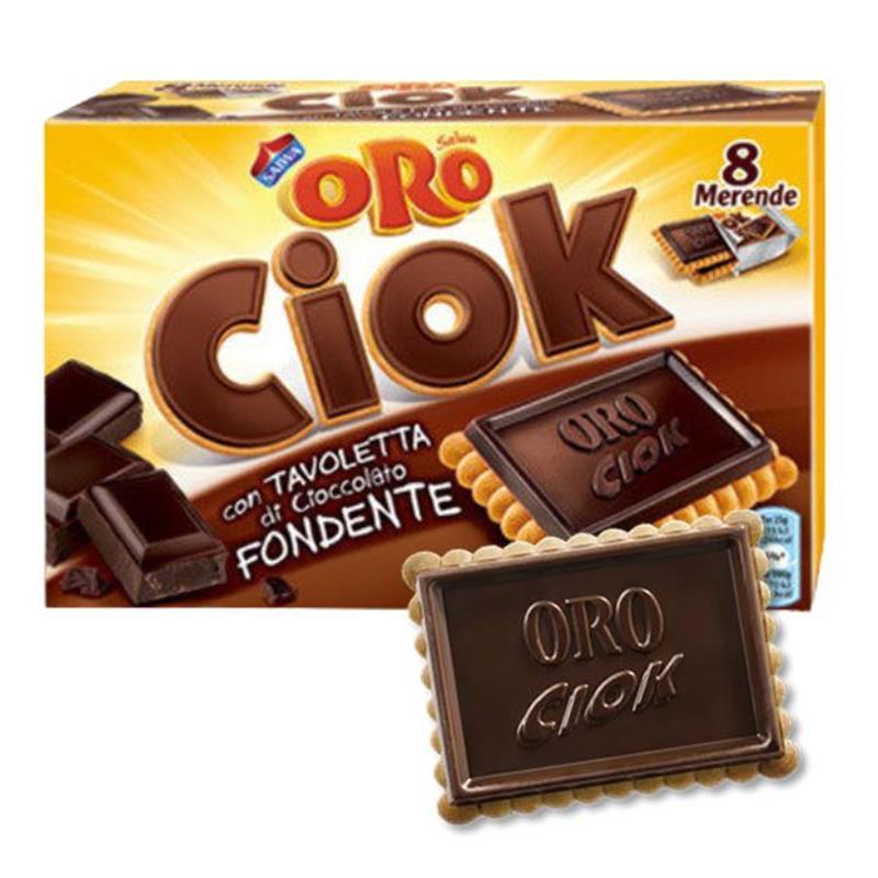 Biscotti con tavoletta di cioccolato al latte. Dall'unione di un biscotto oro saiwa e di una deliziosa tavoletta di cioccolato nasce oro ciok.