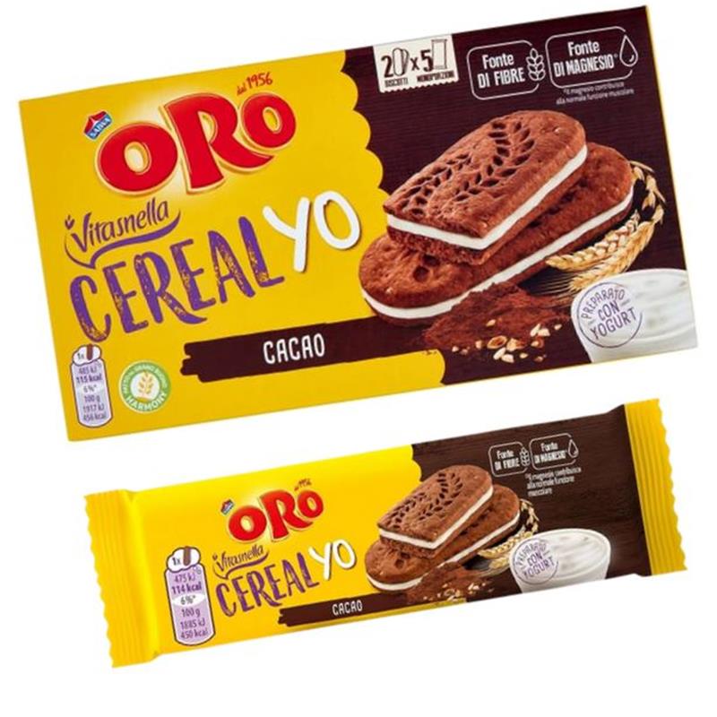 CEREAL YO CACAO FORMATO FAMIGLIA 1X5 PER UNA PAUSA GOLOSA SEMPLICE, UNA CREMOSA FARCITURA PREPARATA CON DELIZIOSO YOGURT, RACCHIUSA TRA DUE BISCOTTI DI CEREALI INTEGRALI CON CACAO BISCOTTI AI CEREALI E AL CACAO MAGRO ARRICCHITI CON CALCIO, MAGNESIO, FERRO VITAMINE (E, B1) E CON FARCITURA (28%) PREPARTA CON YOUGURT MAGRO IN POLVERE.
